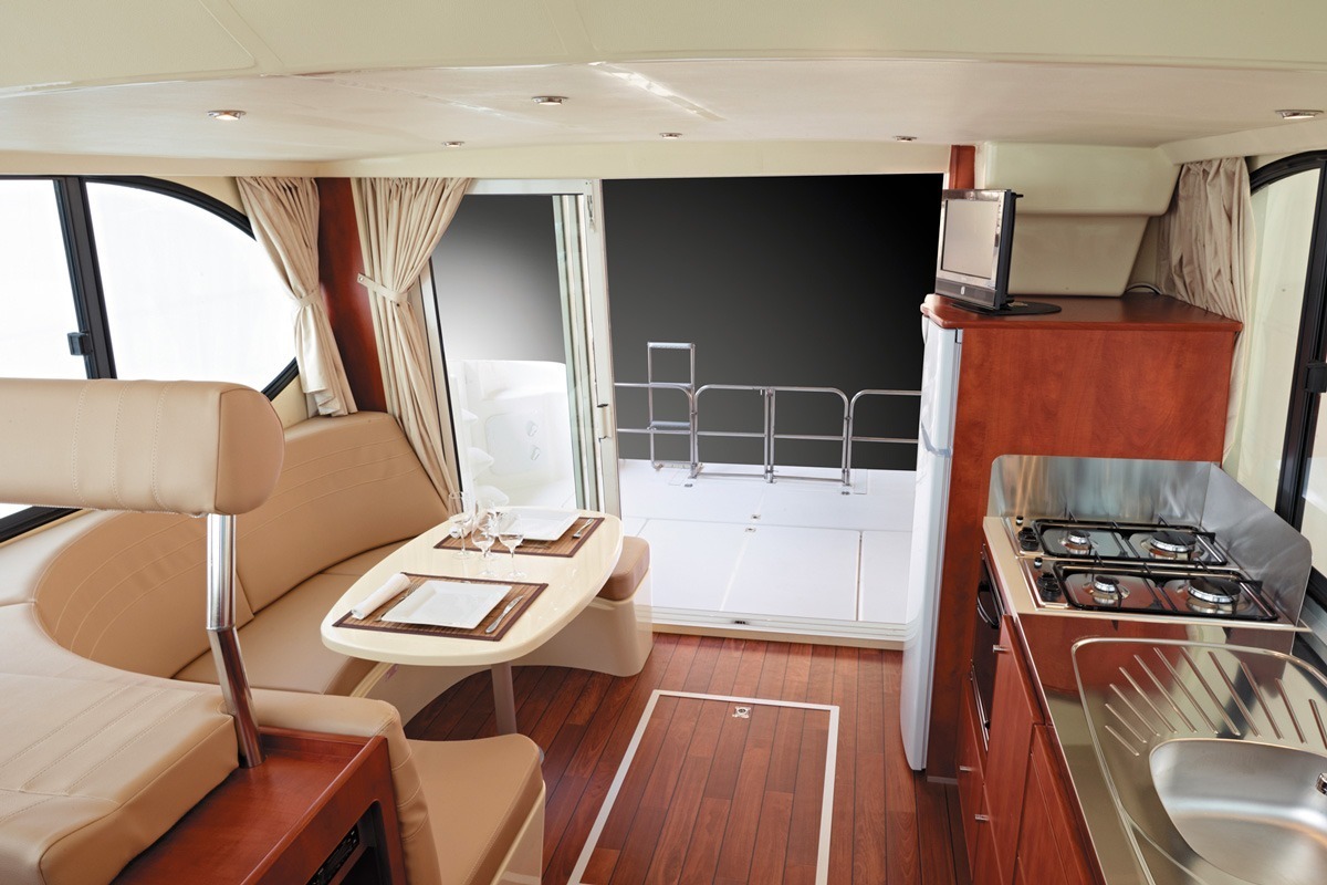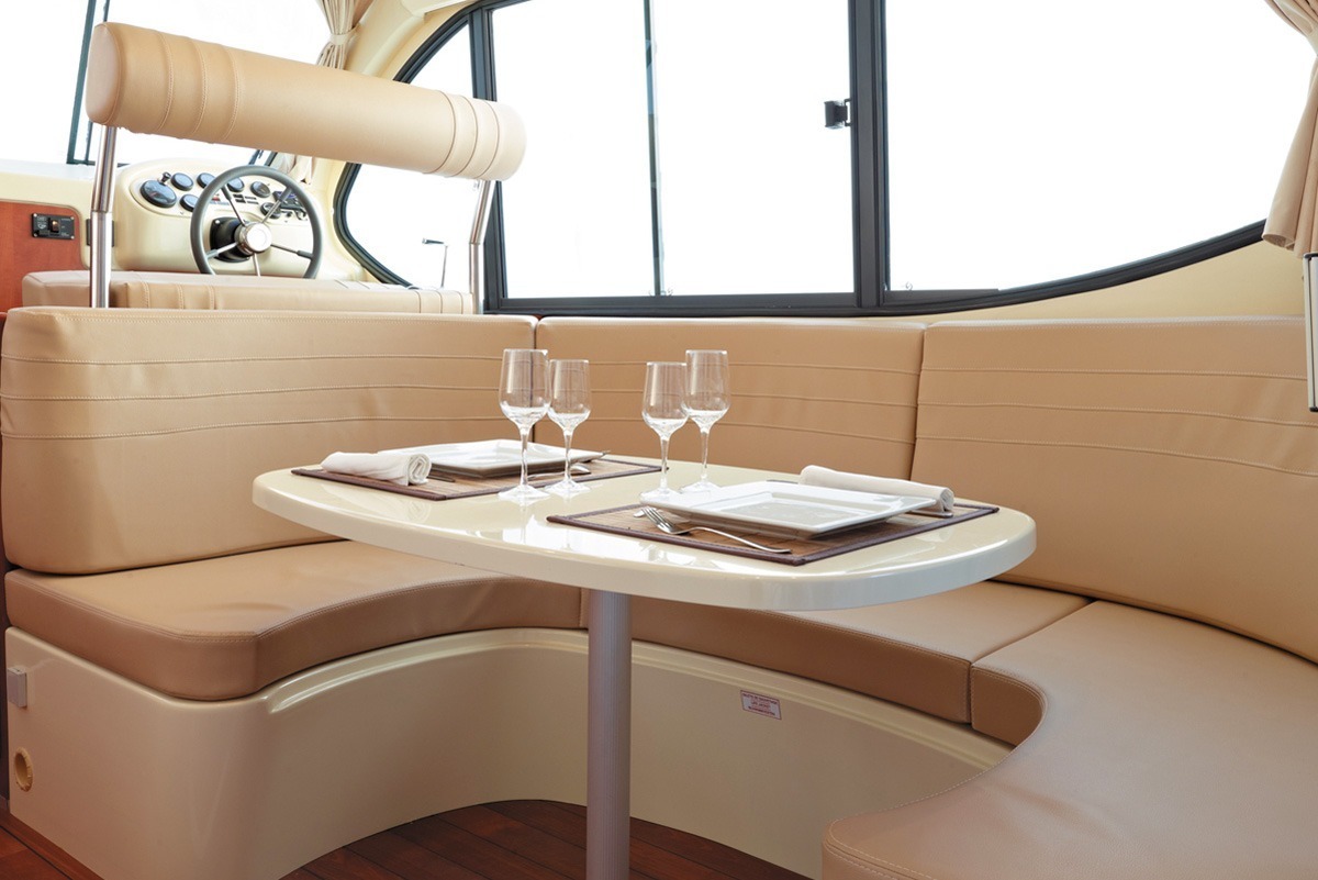 To the fore of the boat, a second small terrace moulded into the hull offers a bench and table to make the most of an unobstructed view of the river while sailing.