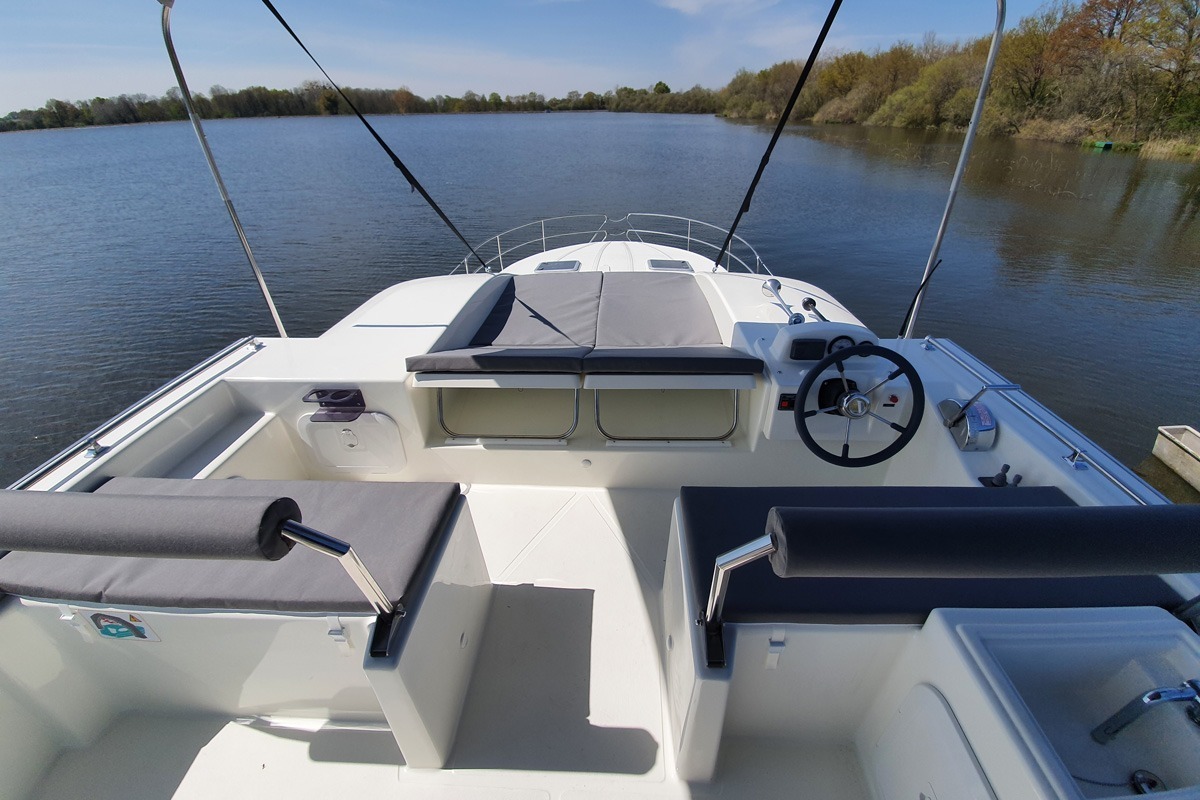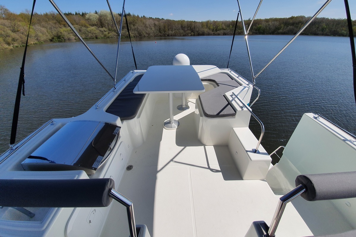 Le bateau dispose d’une terrasse arrière couverte dotée d’un salon de jardin et d’un accès au pont supérieur avec un espace déjeuner ainsi qu’une cuisine extérieure (évier, plancha) à l’ombre sous votre bimini repliable, un deuxième poste de pilotage extérieur et deux matelas de pont pour des séances de farniente ou bronzage… Comme sur les autres bateaux de la gamme Estivale, l’échelle de bain et la douchette de pont raviront les amateurs de baignade…