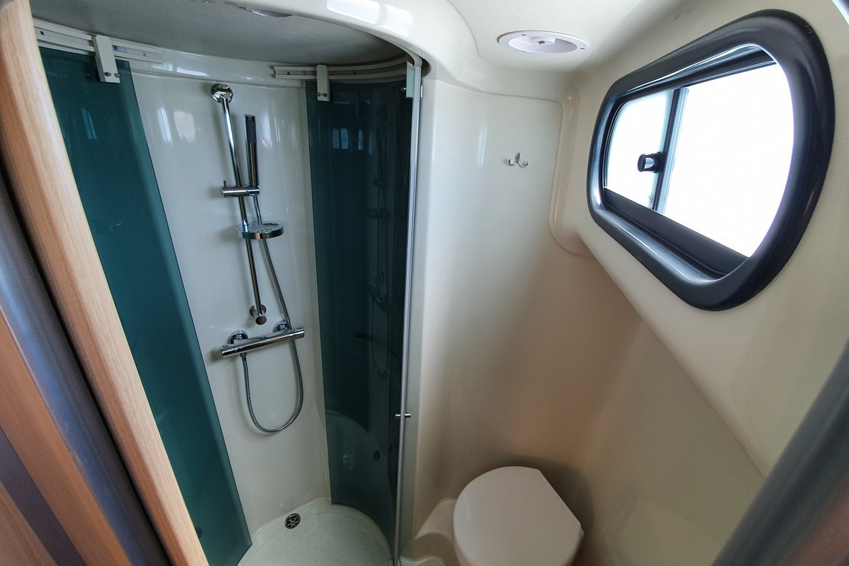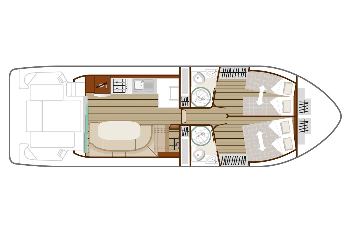 Cette vedette fluviale est équipée de 2 cabines et de 2 salles de bain, ce qui en fait le bateau idéal pour partir avec 2 couples ou 1 couple et 2 enfants offrant le meilleur confort existant sur le marché du tourisme fluvial : grand frigo, plaque de cuisson et four, télévision avec antenne satellite, radio/CD/MP3, prise de quai 220 volts, groupe électrogène pour bénéficier du 220 volts même en navigation, sans oublier la climatisation, bien appréciée notamment sur le Canal du Midi !