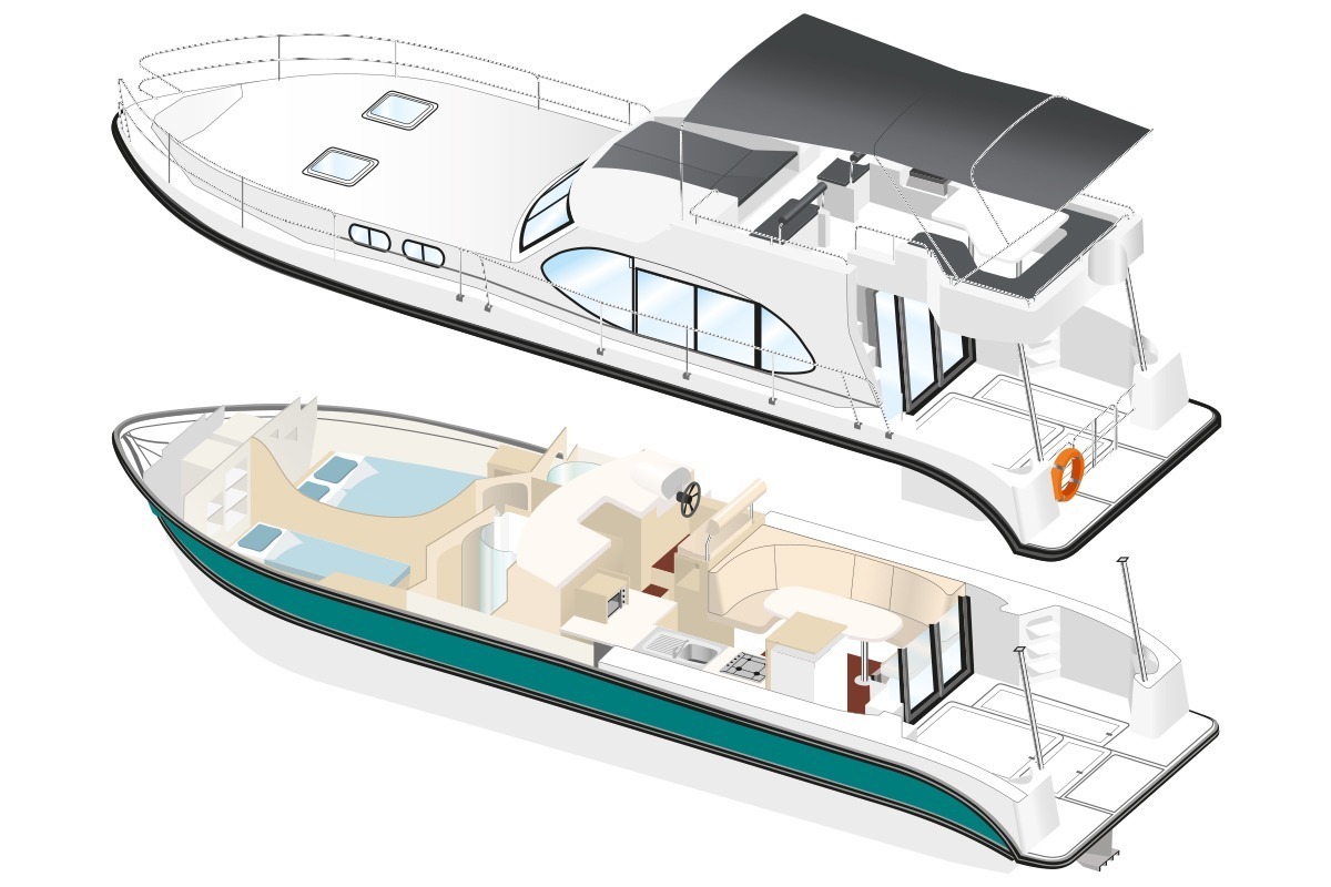 Ce bateau existe également en version Hybride, le moteur Diesel thermique classique est remplacé par une motorisation électrique et un groupe électrogène :